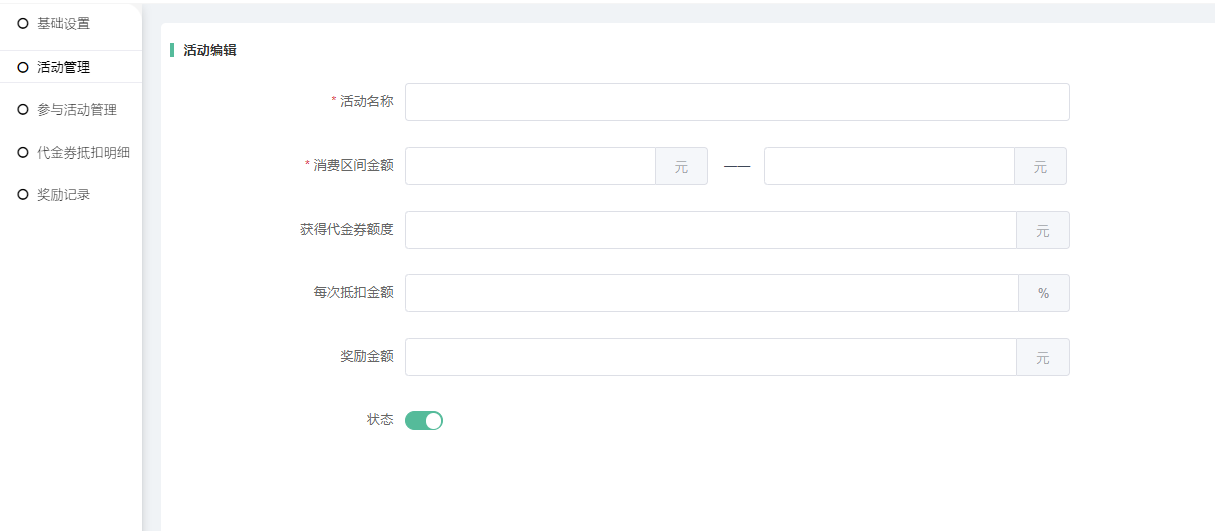 1,新增活动:设置活动名称、消费区间金额、代金券金额、每次抵扣金额、奖励金额